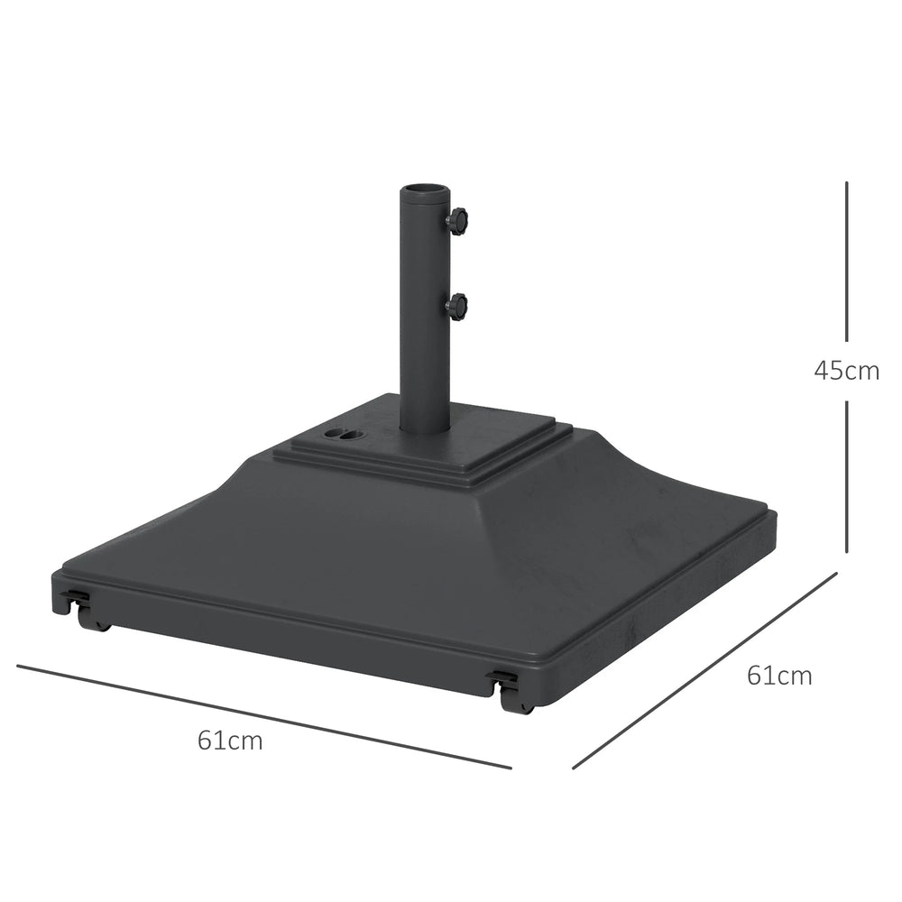 Keep parasol umbrellas firmly held in place: look to this Outsunny patio umbrella base. Made from strong HDPE plastic, this is durable piece, resistant to light wear-and-tear. It's fitted with four wheels to roll easily when full. Fill with 45kg water or 60kg sand for plenty of weight. A powder coated steel pole for the parasol, complete with tightening screws to secure in place.