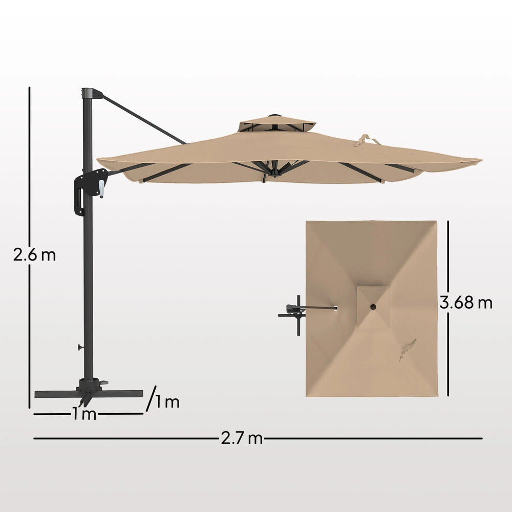 Outsunny 3.7 x 2.7 m Cantilever Parasol w/360 Rotation and Easy Tilt Adjustment, Aluminium Hanging Offset Outdoor Umbrella w/Double Top, Cross Base, UPF50+ Hanging Sun Shade, Black Pole