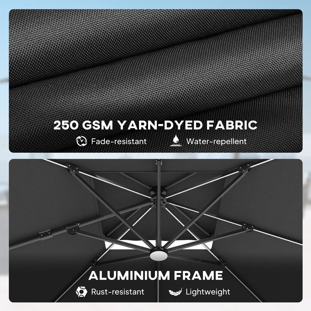 - Quality material: Made from 250 gsm yarn-dyed fabric with superior fade resistance, this led parasol stays vibrant season after season. UPF50+ protection blocks UV rays, while the triangular structure, aluminium frame and 8 ribs ensure lasting durability
