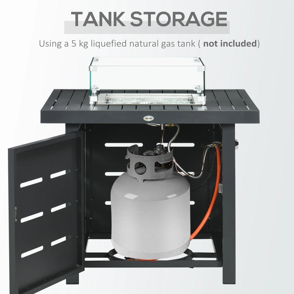 - Fire pit table: Great for evenings and milder months. Wind guard and thermocouple cut-off valve for safety, with a 50,000 BTU output - you can keep warm as you sit around. 5kg gas tank required, not included. Pulse fire ignition is super fast.