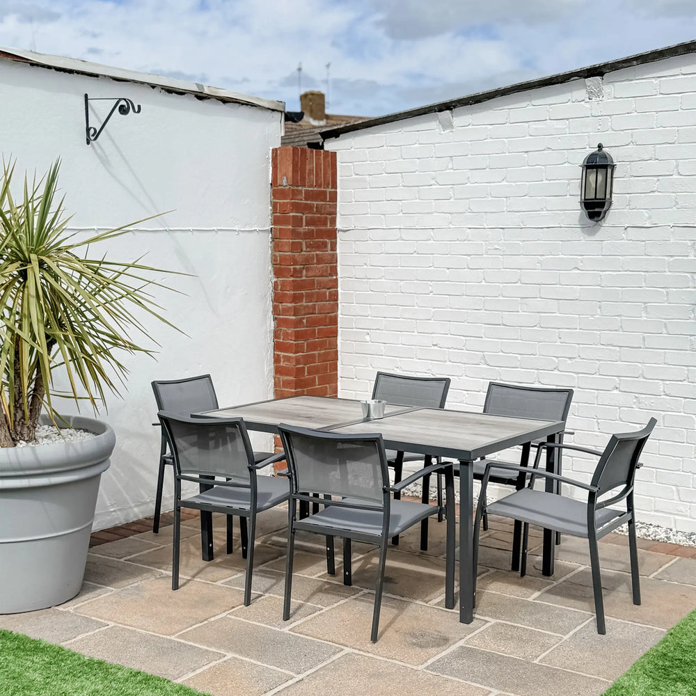 - Comfortable, stackable chairs: Mesh seats and backs hold your body, suitable for extended sitting outdoor. Chairs stack, so garden table and 6 chairs doesn't take up too much space.