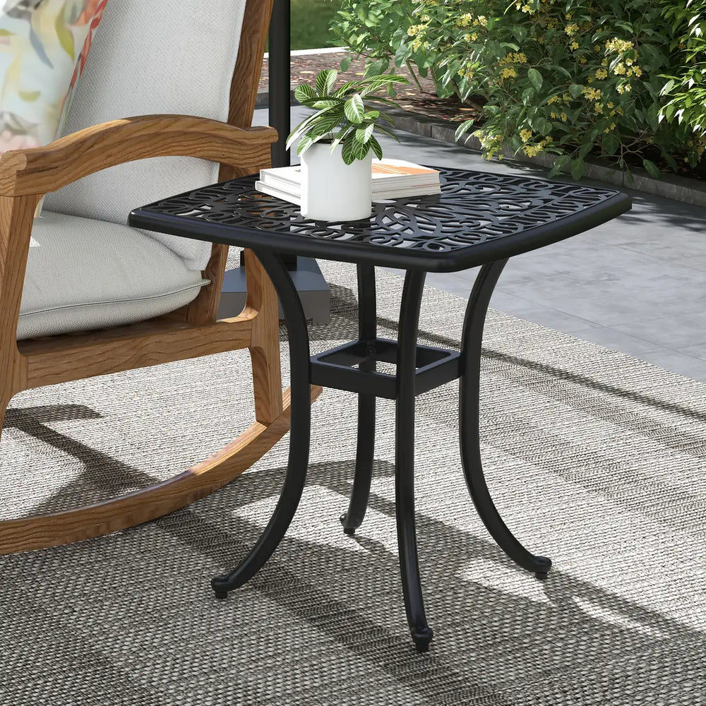 - Elegant: A floral cut-out table top and curved legs - square garden side table is a welcome addition to your outdoor area.