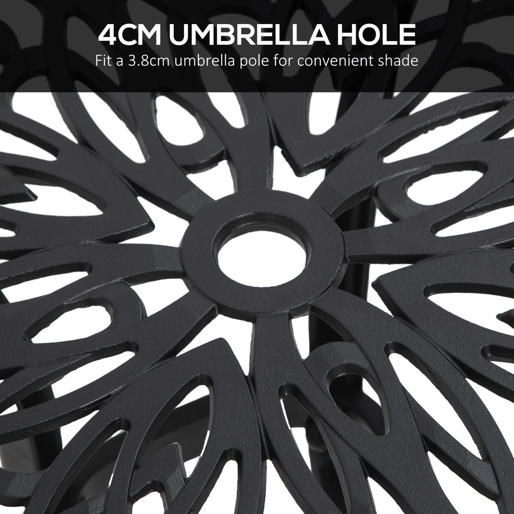 Enhance your outdoor with this Outsunny bistro table. Comes with a floral cut-out tabletop with curved legs for a beautiful design. Made from cast aluminium frame, with a powder coated finish, this is a strong outdoor coffee table suitable for year-round year. Comes with a 3.55 cm central hole to hold parasol in place.