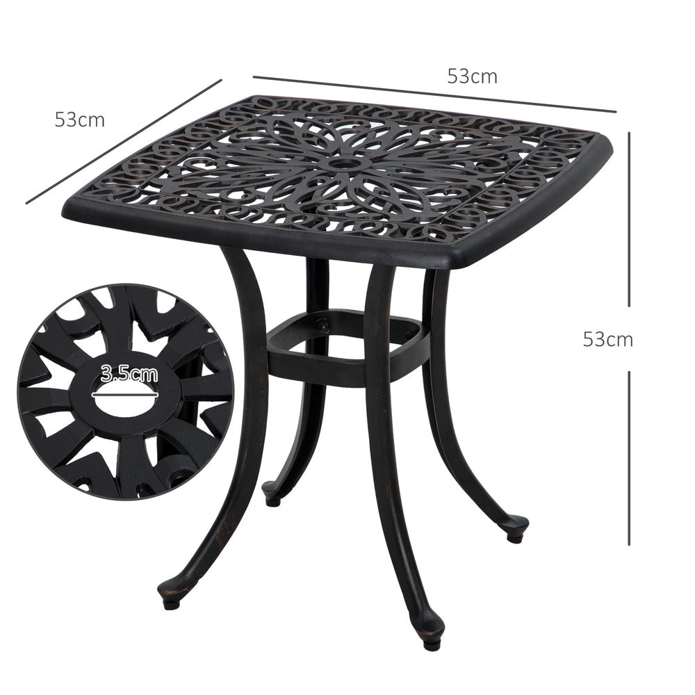Outsunny Cast Aluminium Bistro Table, Outdoor Square Side Table with Umbrella Hole, Garden Table for Balcony, Bronze Tone