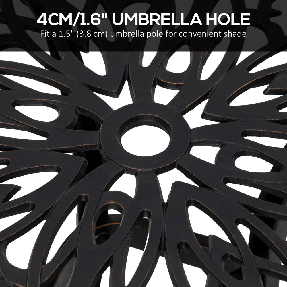 Enhance your outdoor with this Outsunny bistro table. Comes with a floral cut-out tabletop with curved legs for a beautiful design. Made from cast aluminium frame, with a powder coated finish, this is a strong outdoor coffee table suitable for year-round year. Comes with a 3.55 cm central hole to hold parasol in place.