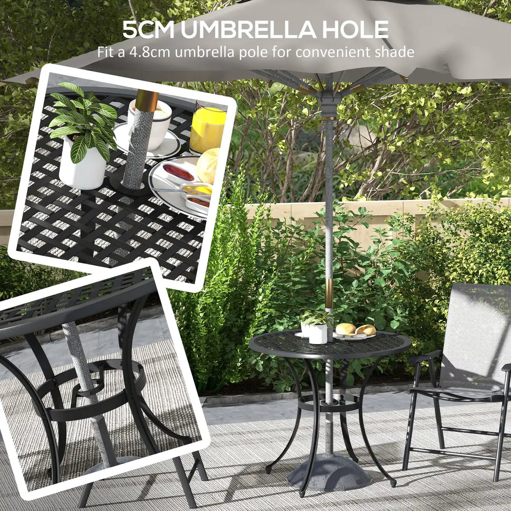 Enhance your outdoors with this Outsunny bistro table. The grid tabletop is aesthetic and practical: prevents water building up. Made from cast aluminium, with a powder coated finish for a strong piece. Complete with a 5cm parasol hole for a parasol umbrella.