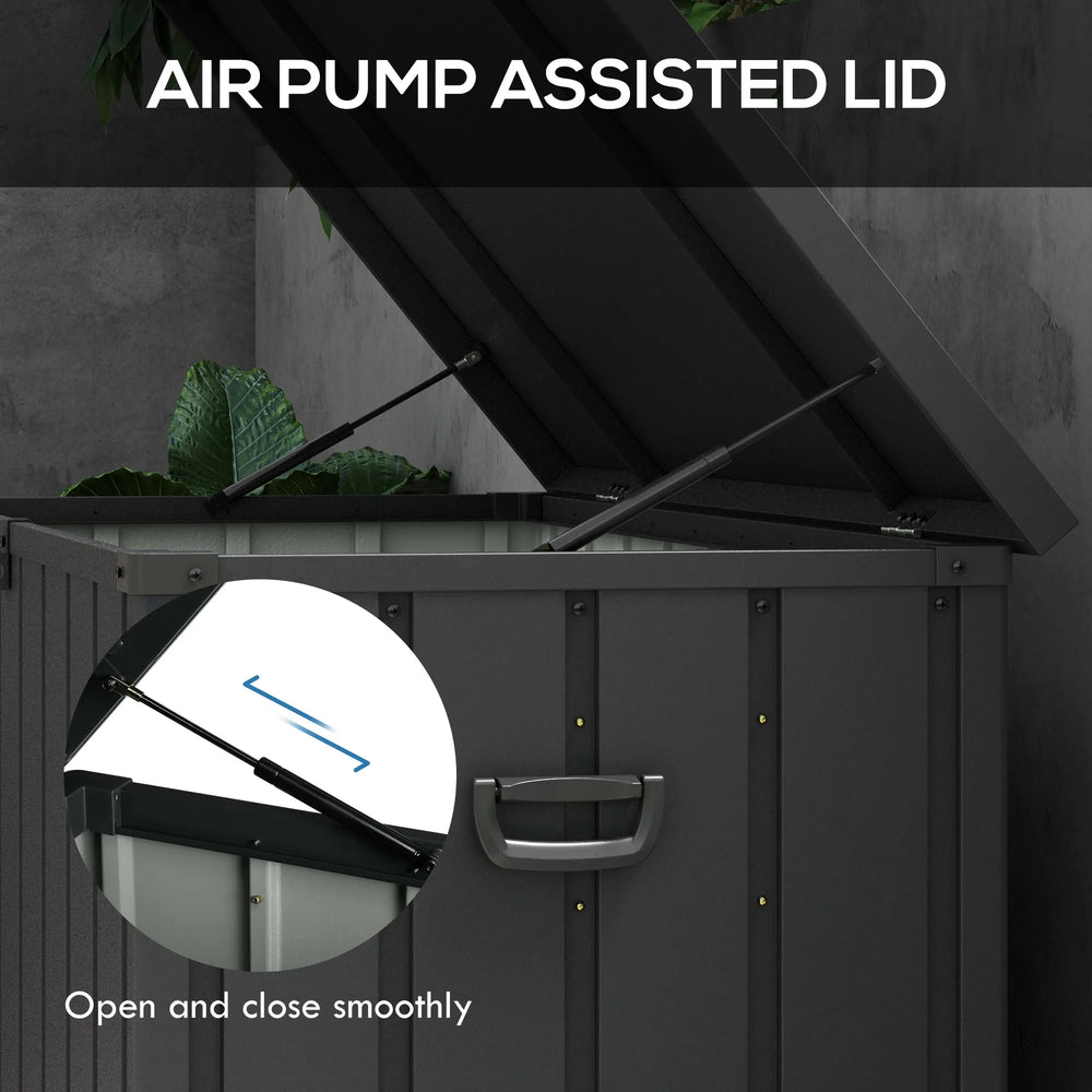 Tough metal outdoor storage comes in the form of this Outsunny lockable garden storage box. The 450L capacity offers plenty of holding room for furnishings, garden accessories, tools and more. Made from thick steel, this waterproof storage box is strong, with an air pump on the lid for smooth, easy opening and closing. It comes with two handles and four wheels so you can move it around easily, whether empty or full.