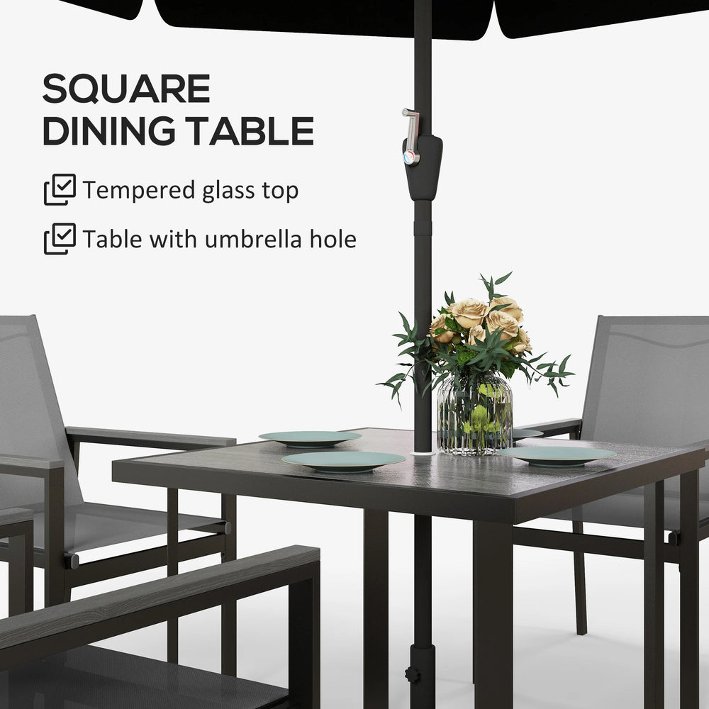 Enjoying weekend brunches, evening dinners outside - thanks to this Outsunny dining set. Comes one sqare dining table and four matching chairs for you and others to gathering around. Powder coated steel frames mean strong pieces. The 5mm tempered glass top on the table means a sleek look and safe surface to dine from.