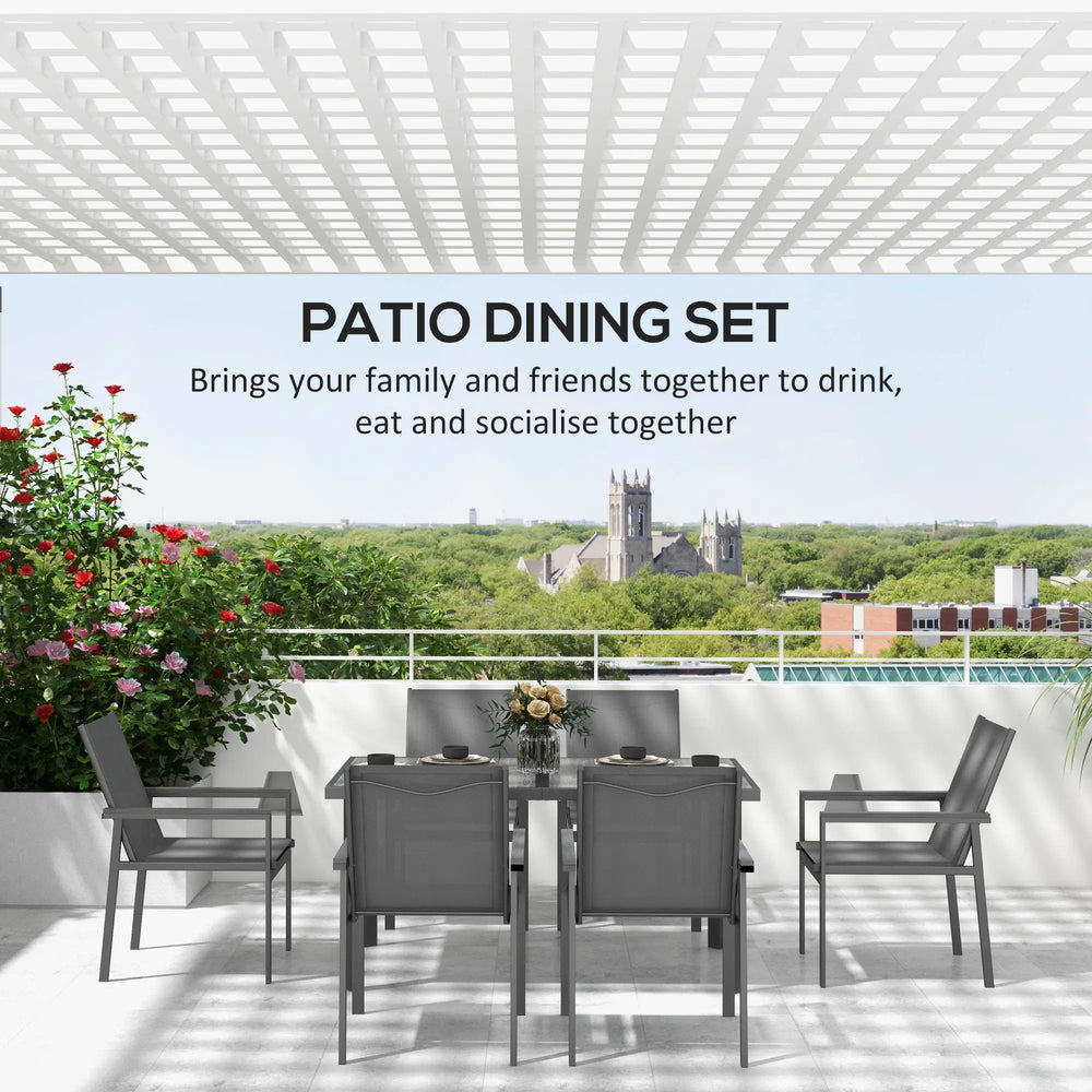 Enjoying weekend brunches, evening dinners outside - thanks to this Outsunny dining set. Comes one rectangular dining table and six matching chairs for you and others to gathering around. Powder coated steel frames mean strong pieces. The 5mm tempered glass top on the table means a sleek look and safe surface to dine from.