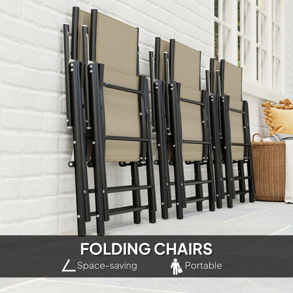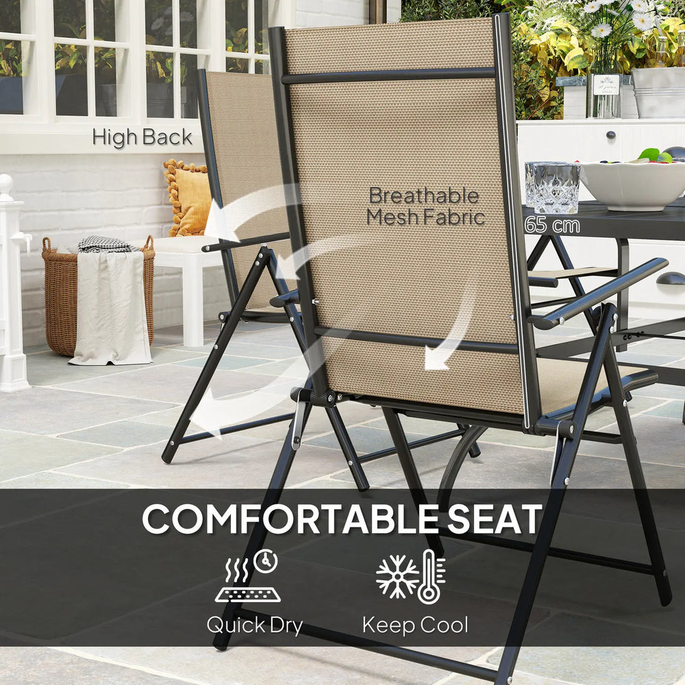 Simple, stylish outdoor dining with this Outsunny outdoor dining table and chairs set. It comes with a rectangular dining table and six matching folding chairs: plenty of room for you and company. The powder coated galvanised steel frames mean the patio table and chairs are strong. The folding chairs save space and come with breathable texteline seats for comfort. This outdoor garden furniture set is complete with 50mm hole in the table to hold a parasol umbrella in place.
