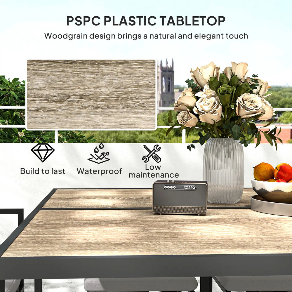 - Steel frames: Powder coated for extra strength - outdoor dining table and chairs are strong and support you fully when being used. Plastic tabletop is tough, with a beautiful wood-effect finish.