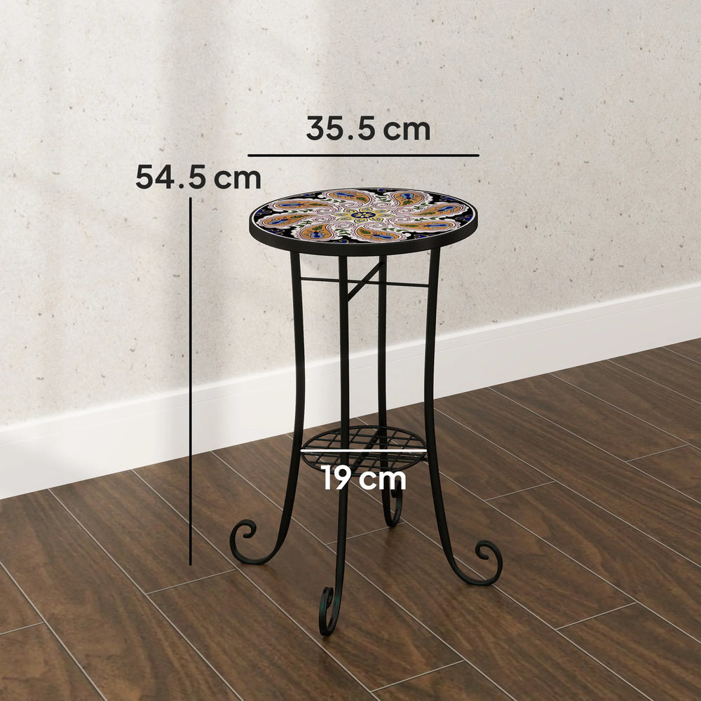 Add a splash of colour to your outdoor space with the Outsunny round garden table. This charming and striking patio table features a vibrant mosaic top and gracefully curved legs. With electrophoretic metal frames, this outdoor side table is strong to resistant water, weather and rust, complete with four legs for plenty of balance. It's not only a fetching small side table or bistro table but also includes a handy lower shelf for displaying plants or decorations.