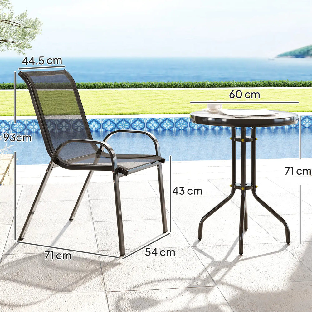 Simple, stylish outdoor garden furniture for relaxing or dining with this Outsunny patio set. It comes with a round table and four chairs to sit outdoors with company; the chairs are stackable to save space when not being use. Powder coated steel frames mean strong, tough cores on the patio table and chairs, suitable for outdoor use.