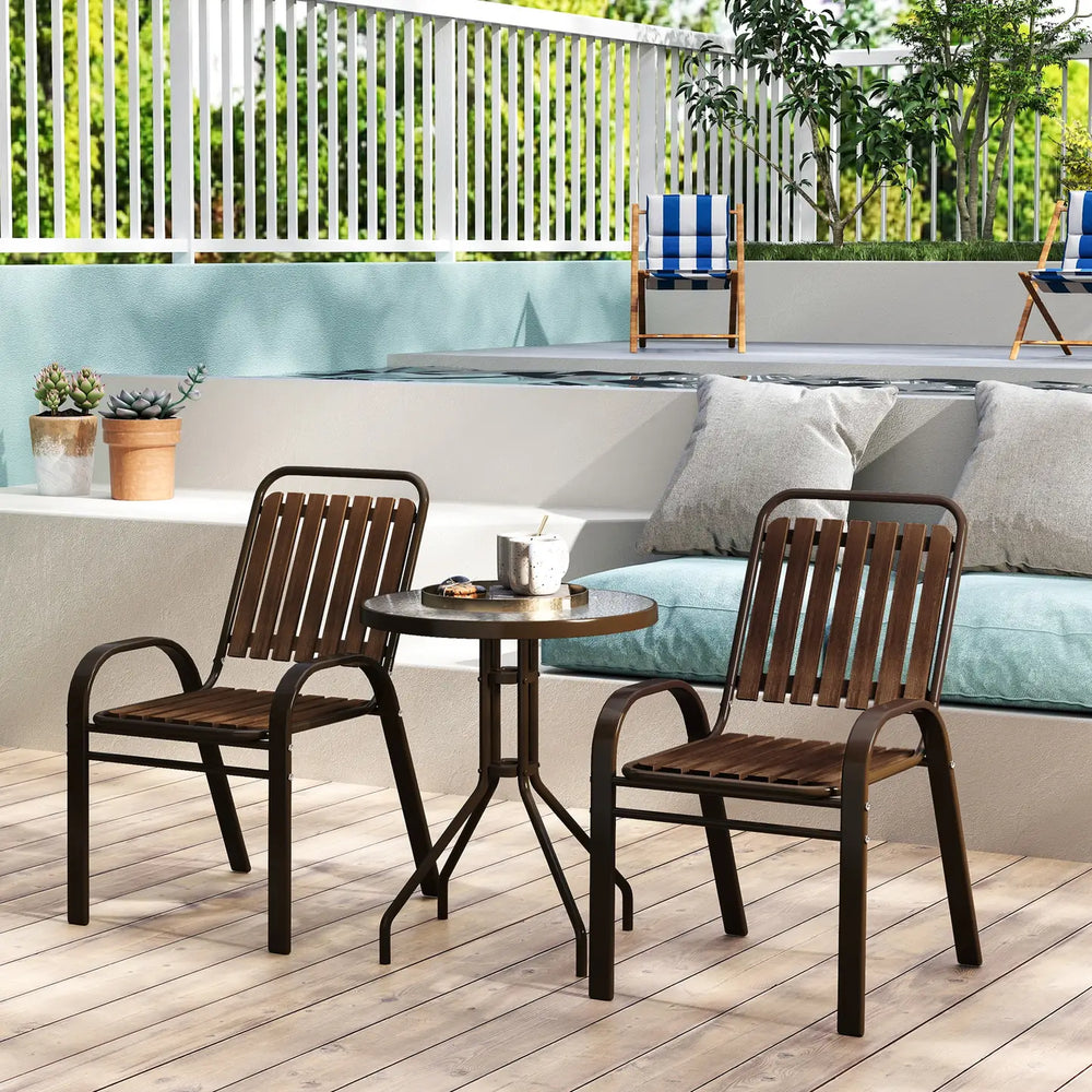 Discover the charm of the Outsunny Outdoor Bistro Set! This chic patio set features two armchairs with a stylish wood grain veneer and a sophisticated water-ripple tempered glass coffee table. Its stackable design makes it a space-saver for any garden, patio, or balcony, ensuring elegance and functionality in your outdoor space. Enjoy the blend of beauty and practicality, suitable for any conservatory or garden setting.
