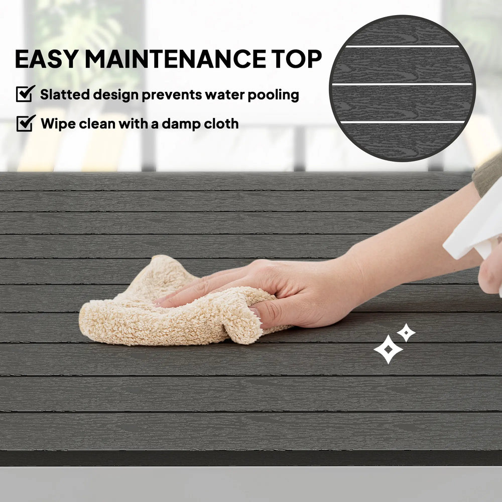 - Easy maintenance top: Crafted from PS, the slatted design of this patio table allows for easy cleaning and ensures water won't pool, maintaining a neat and hygienic surface for all your outdoor dining occasions.