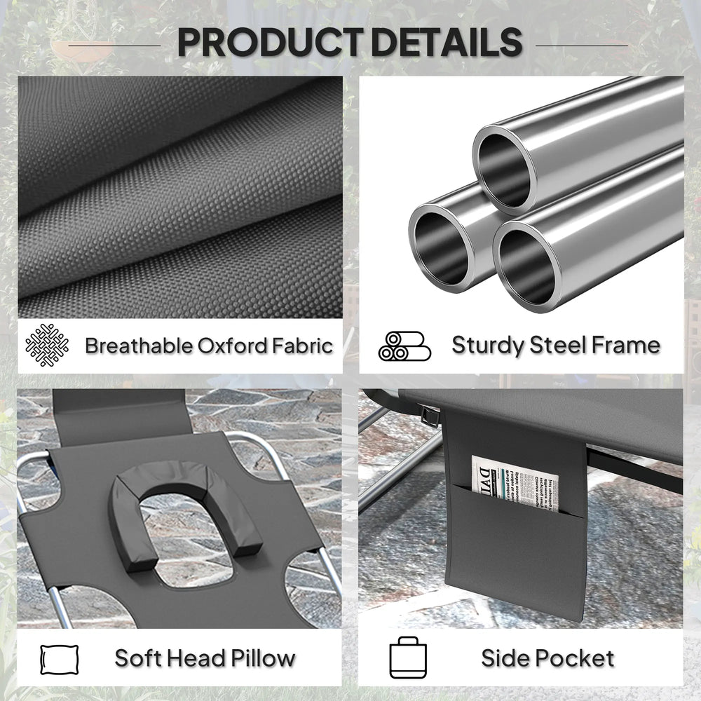 Outsunny Foldable Sun Lounger Set of 2, Beach Chaise Lounge with Reading Hole, Arm Slots, 5-Position Adjustable Backrest, Side Pocket, Pillow for Garden, Beach, Pool, Dark Grey