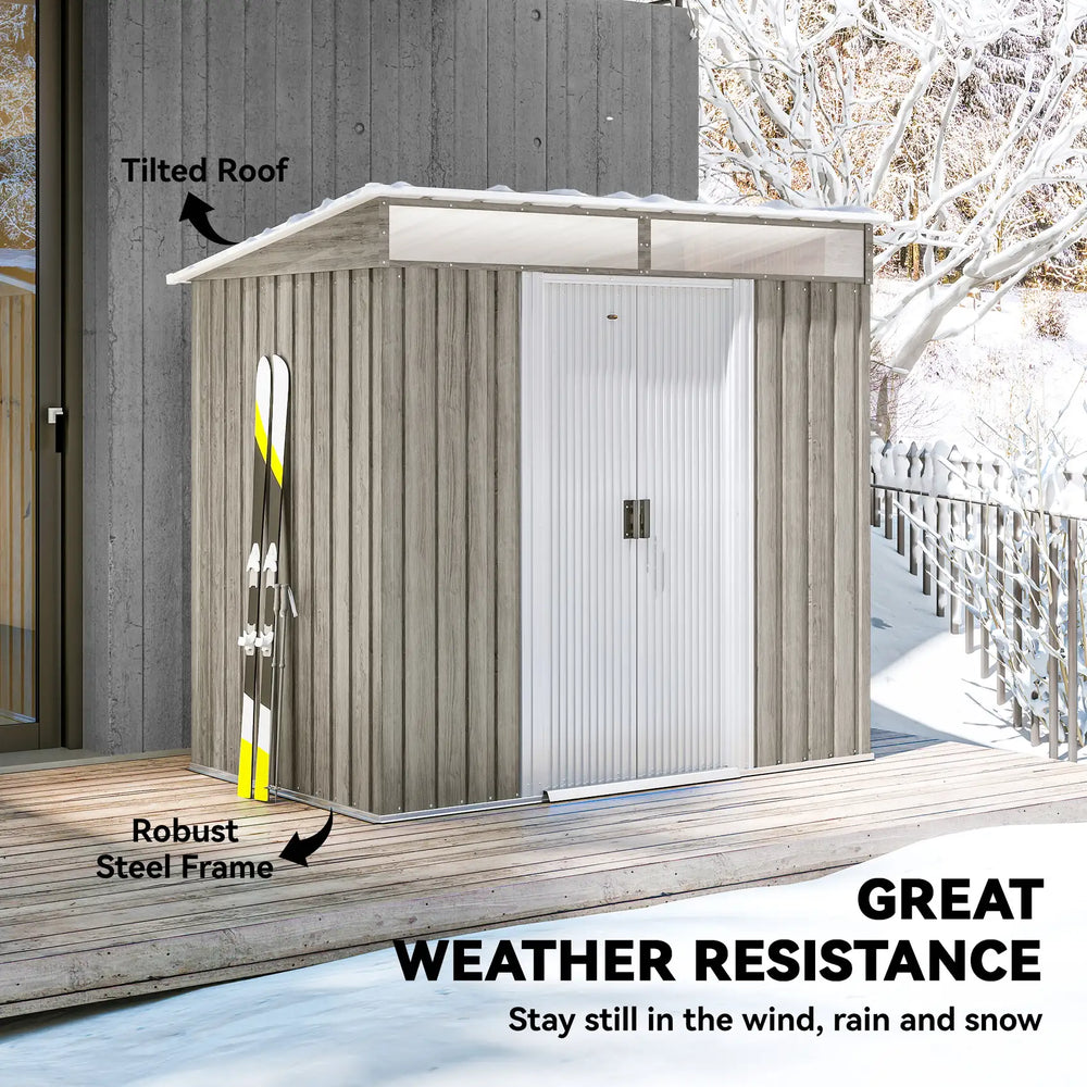 Outsunny 6.5 x 4FT Galvanised Metal Shed with Foundation Kit, Lockable Tool Garden Shed with Double Sliding Doors, Vents, Light Grey Wood Effect is backordered and will ship as soon as it is back in stock.
