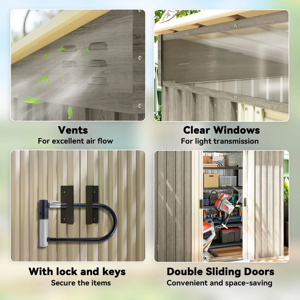 - Secure double doors: The outdoor storage shed Features sliding doors with a locking system for safe and accessible outdoor storage; lock and key included.