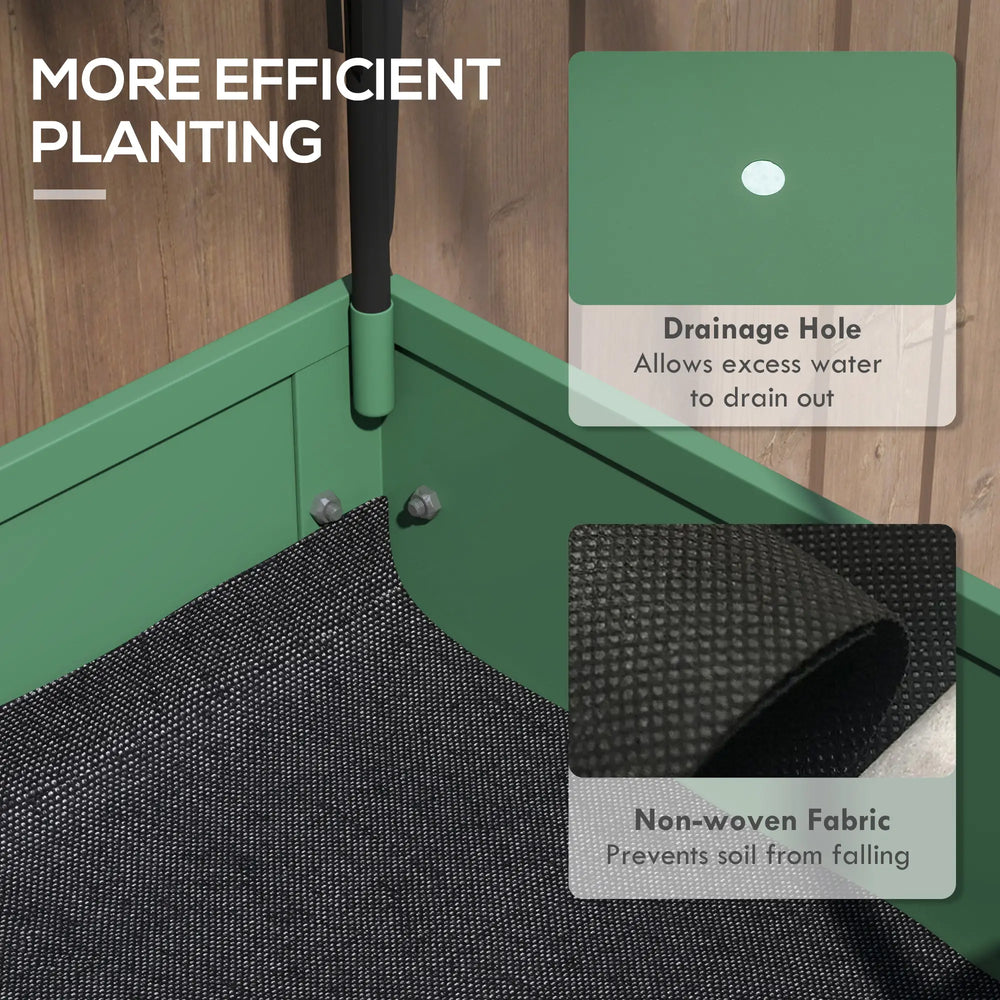 This Outsunny raised planter offers a place for many plants, vegetables and others. A steel raised planter, fitted with a plastic cover for a safe shield. Features a bottom shelf for handy holding room. The bed liner holds all soil together, with drainage hole to allow water to drain gently. Complete with two wheels with brake.