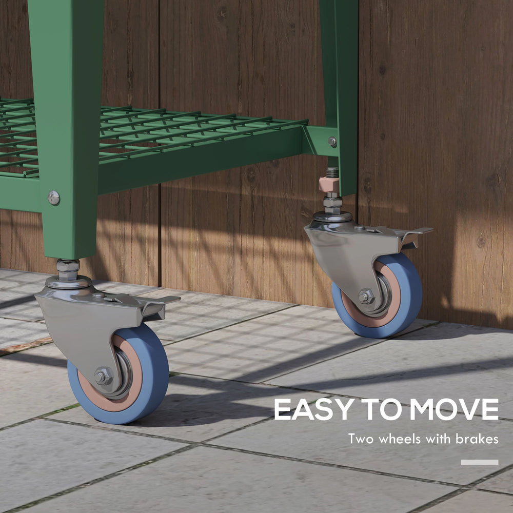 - Metal frame with bottom shelf and wheels: A strong and supportive structure. Bottom shelf on garden planter offers handy holding room for items you want close. Wheels to move easily, with brakes to lock into place.