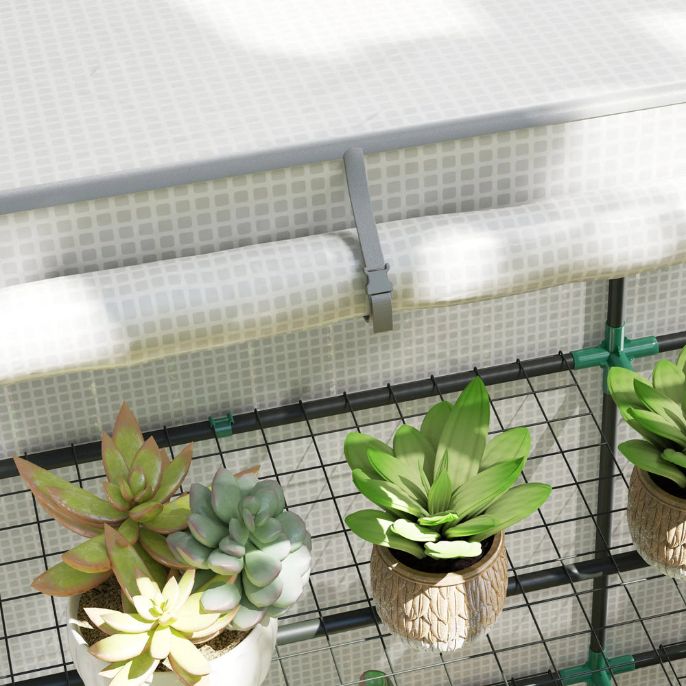 Grow greenery practically anywhere with this Outsunny greenhouse. The three inner shelves offer plenty of space for plants, flower pots and seed trays; the 140g/m2 plastic cover shields inside from outer weather. Complete with a zipped door, which rolls up and holds in place to allow in fresh air to promote healthy growth.