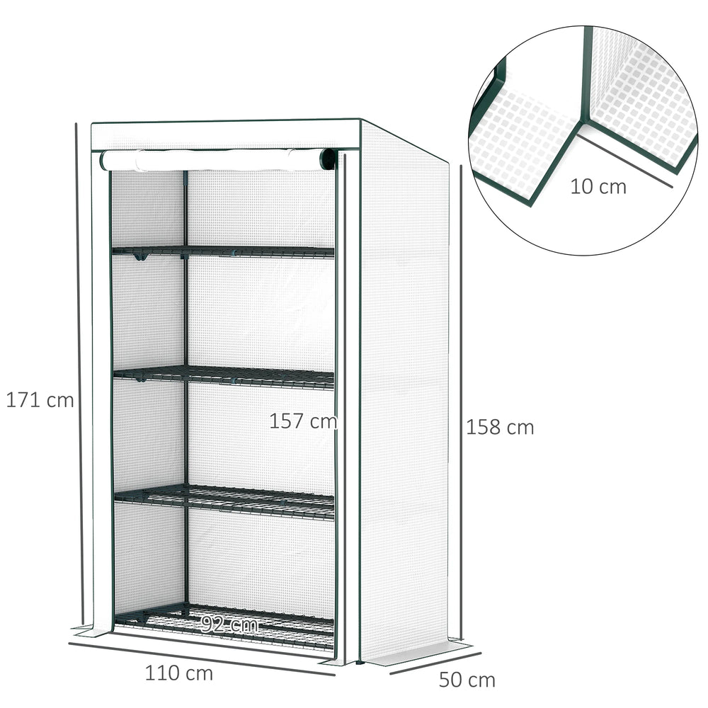 Grow greenery practically anywhere with this Outsunny greenhouse. The four inner shelves offer plenty of space for plants, flower pots and seed trays; the 140g/m2 plastic cover shields inside from outer weather. Complete with a zipped door, which rolls up and holds in place to allow in fresh air to promote healthy growth.