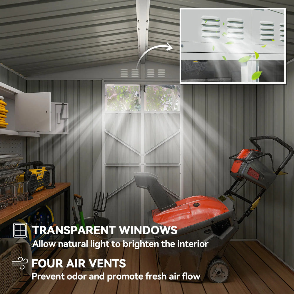 Discover the charm of tidiness with the Outsunny metal garden shed. Spaciously designed to house everything from bikes to garden tools, this garden shed features double doors for easy access and secure storage. Enjoy natural light with two transparent windows and keep the air fresh with four well-placed vents. Made from anti-UV, rust-resistant galvanised steel, it's the stylish haven for all your outdoor essentials.