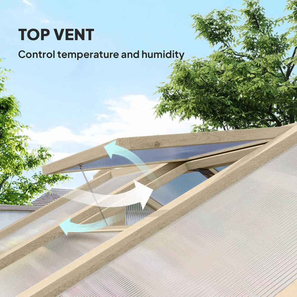 Discover the joy of gardening all year round with the Outsunny Polycarbonate Greenhouse. This walk-in greenhouse features thick panels that trap warmth and sunlight, while the robust fir wood frame ensures stability. Enjoy the control over your plant's growing condition with an adjustable window, ensuring optimal temperature and humidity levels. Ready to grow your garden dreams?