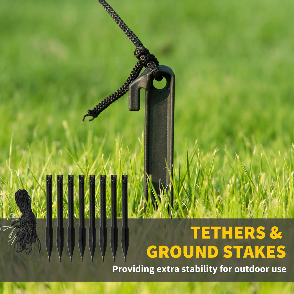- Includes stakes, tethers and sandbags, ensuring it stays stable outdoors