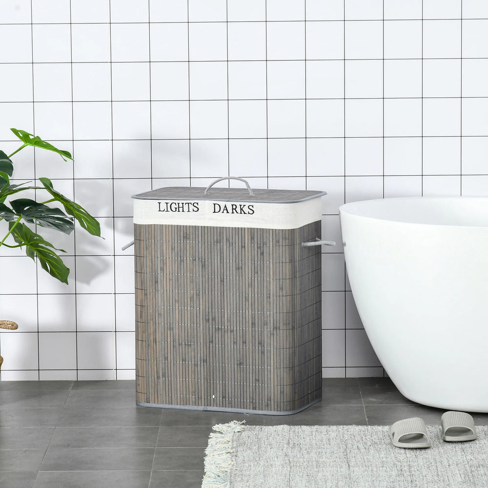 Keep dirty clothes stored and easy and efficient way - with this laundry basket from HOMCOM. There are two sections - a 'light' and a 'dark', meaning less mix-ups when washing - less clothes ruined. The shell is made from natural bamboo, so it's lightweight and naturally resistant to moisture. Perfect for bathrooms and kitchens. Comes complete with handle on the lid and side to carry around easily.