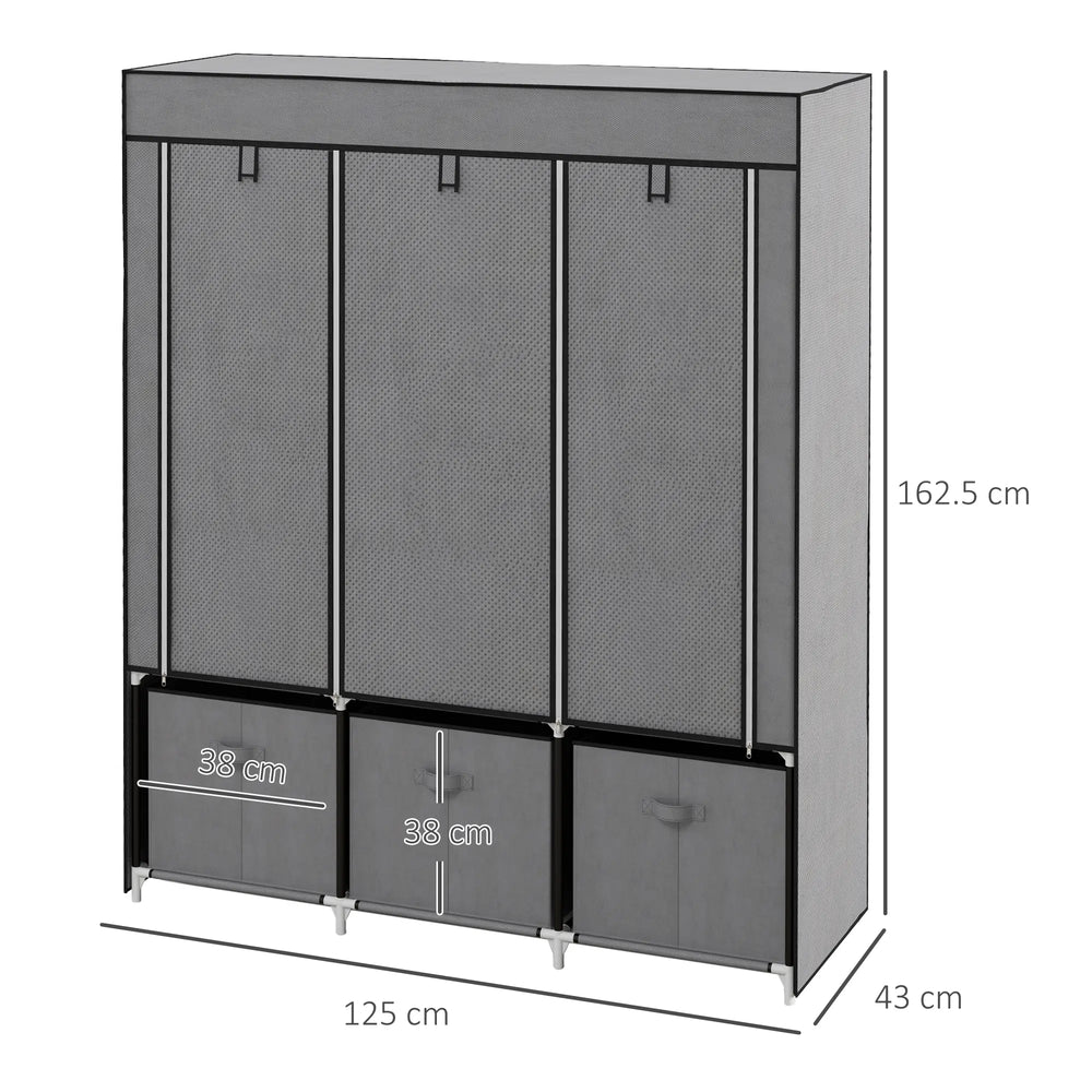 HOMCOM Fabric Wardrobe for Bedroom, Portable Wardrobe with 5 Shelves, 2 Hanging Rails and 3 Fabric Drawers, Foldable Closet, 125 x 43 x 162.5cm, Dark Grey