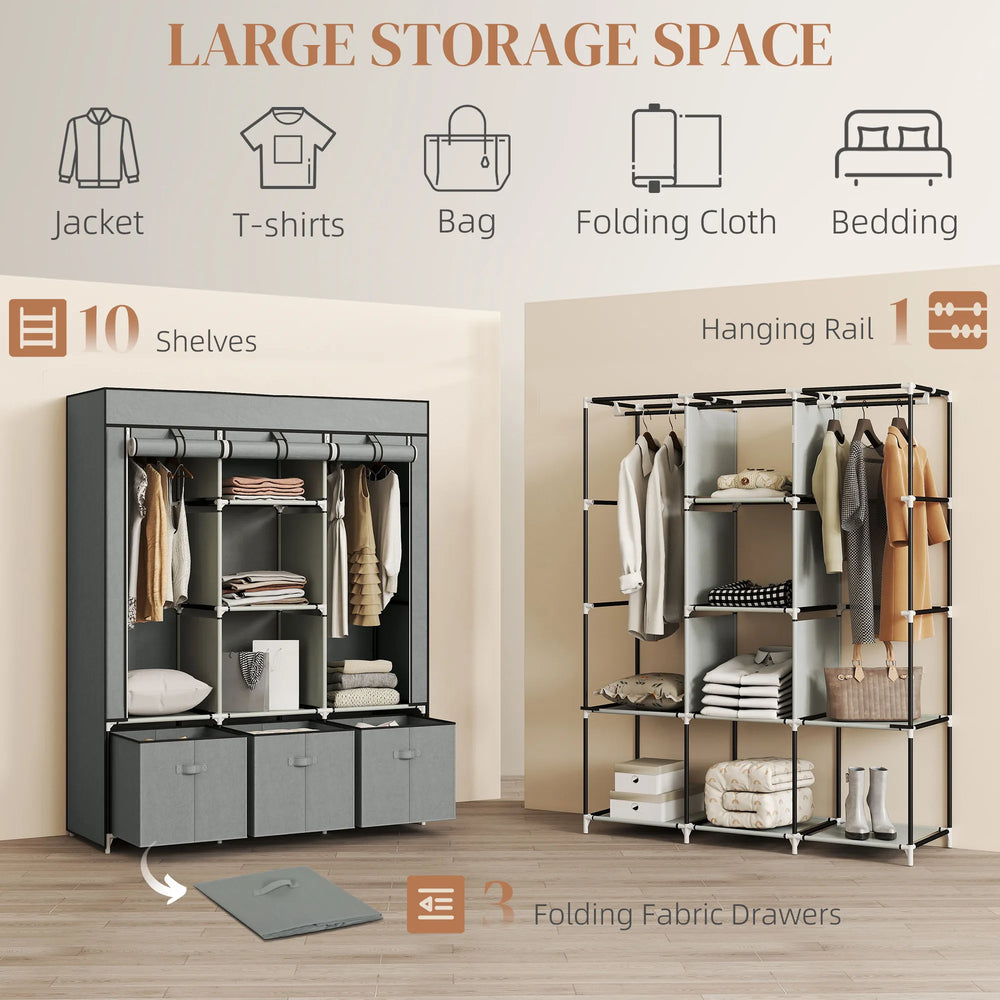 HOMCOM Fabric Wardrobe for Bedroom, Portable Wardrobe with 5 Shelves, 2 Hanging Rails and 3 Fabric Drawers, Foldable Closet, 125 x 43 x 162.5cm, Light Grey