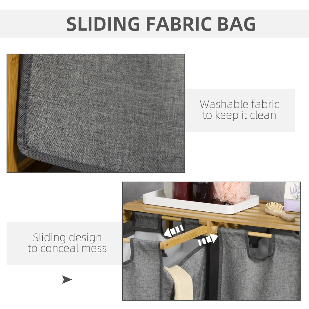 HOMCOM Bamboo Laundry Basket, Laundry Hamper with Shelf, Pull-out Bags for Bedroom, Bathroom, Laundry Room, 64 x 33 x 73 cm, Grey