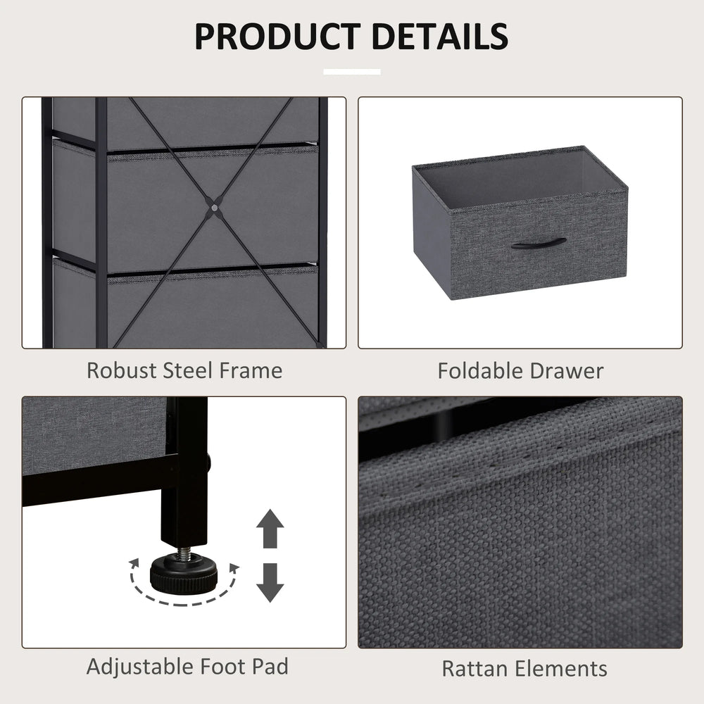 Home storage with this HOMCOM fabric chest of drawers. The five fabric drawers offer room for lots of things - keep t-shirts, tops, bottoms and more organised. The wood-effect top offers more room: a great place to display your favourite photos. The steel frame makes a strong core, with adjustable feet for balance. Comes with anti-tipping straps for safety. Use all over the home and office.