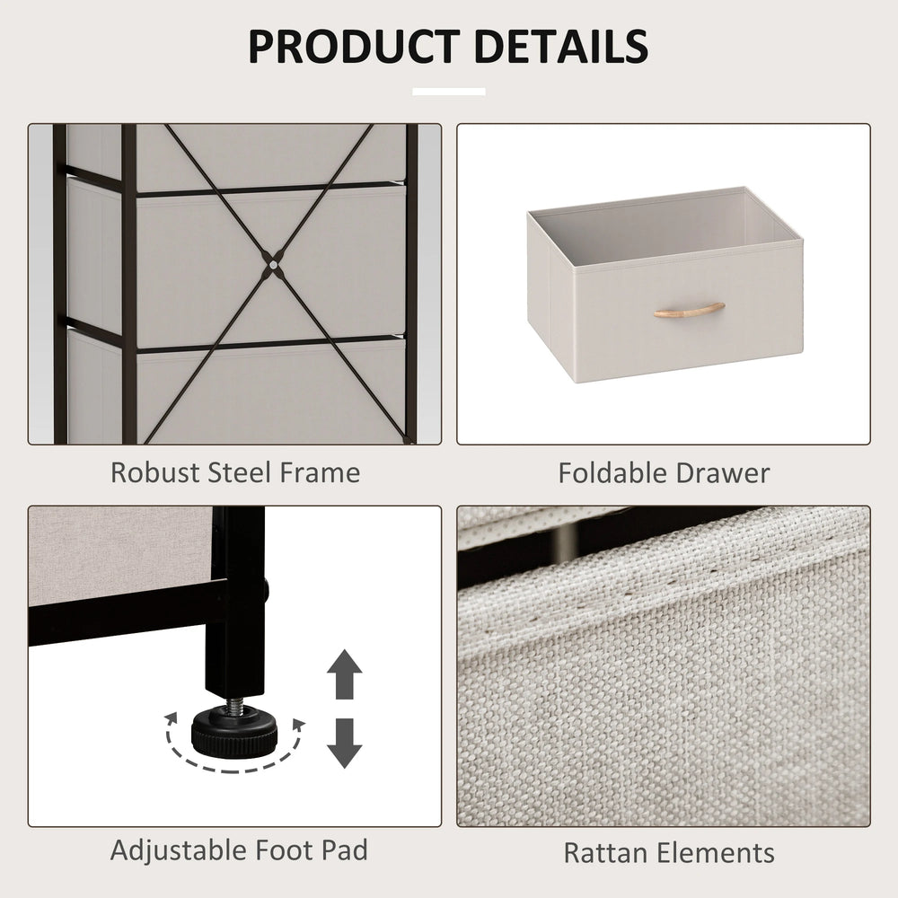 Home storage with this HOMCOM fabric chest of drawers. The five fabric drawers offer room for lots of things - keep t-shirts, tops, bottoms and more organised. The wood-effect top offers more room: a great place to display your favourite photos. The steel frame makes a strong core, with adjustable feet for balance. Comes with anti-tipping straps for safety. Use all over the home and office.