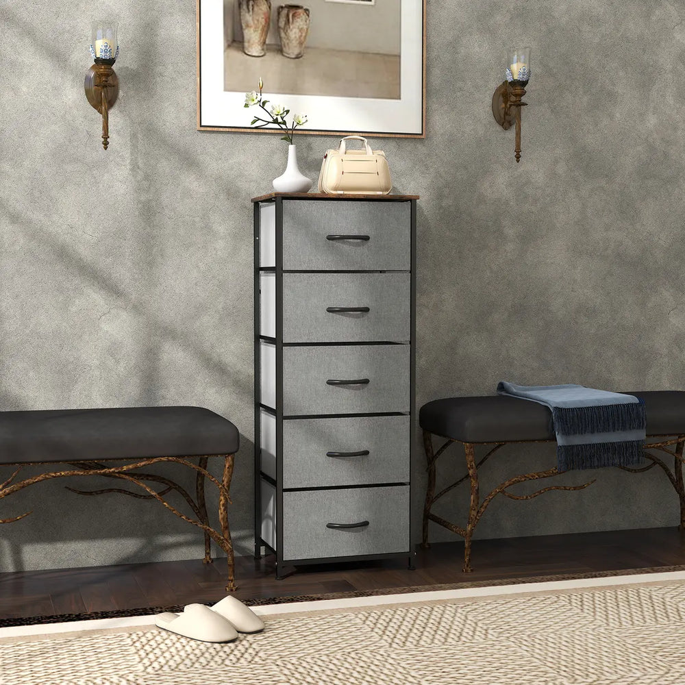 Home storage with this HOMCOM fabric chest of drawers. The five fabric drawers offer room for lots of things - keep t-shirts, tops, bottoms and more organised. The wood-effect top offers more room: a great place to display your favourite photos. The steel frame makes a strong core, with adjustable feet for balance. Comes with anti-tipping straps for safety. Use all over the home and office.