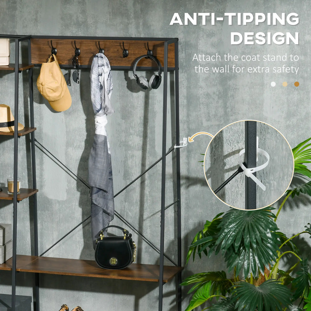 Keeping plenty together, all at once - this HOMCOM hall tree. Combining five hooks, five side shelves and two bottom shelves, there's plenty of room for your outerwear and accessories - great for family use. A steel frame means a strong, supportive structure, with six feet for balance. Coat stand is complete with anti-tipping straps to attach to a floor safely.