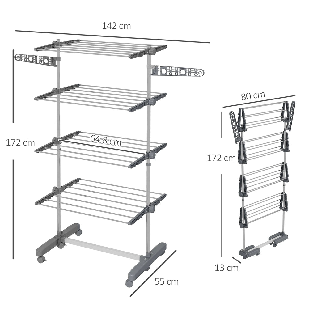 HOMCOM Four-Shelf Collapsing Clothes Horse, With Side Arms and Wheels - Grey