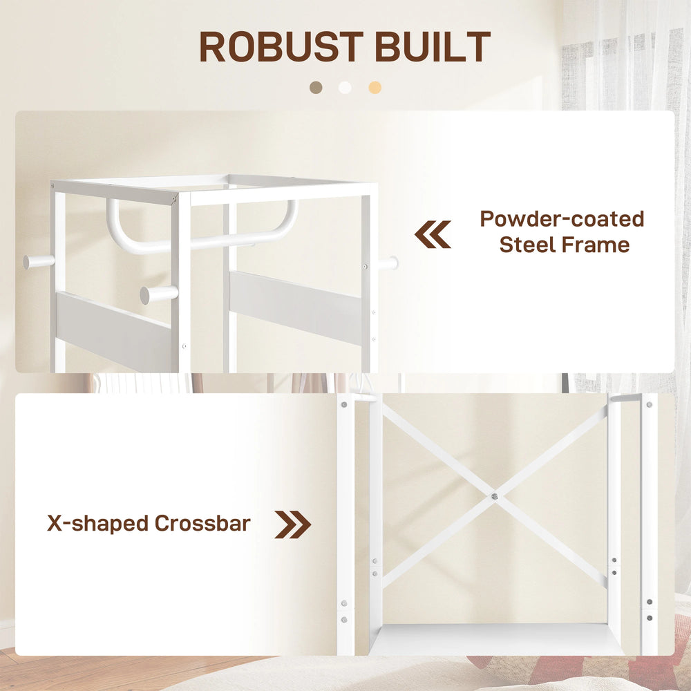 - Steel frame: Powder coated for extra strength, clothes rack supports all garments in place. Smooth and protective melamine coating, with anti-tipping straps to fix unit safely to a wall.