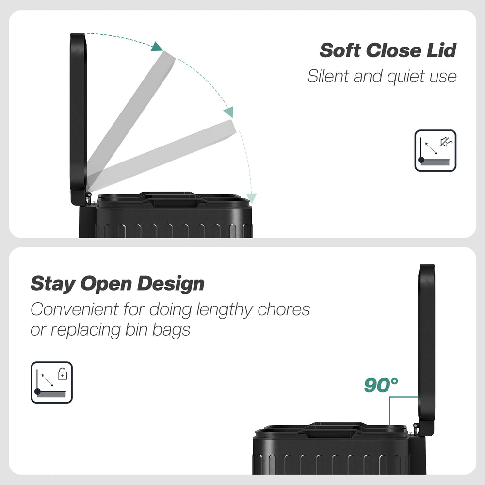- Pedal opening, with soft-close lid: Simply press to open the lid of this rubbish bin. Gently closes so it doesn't disturb your family.