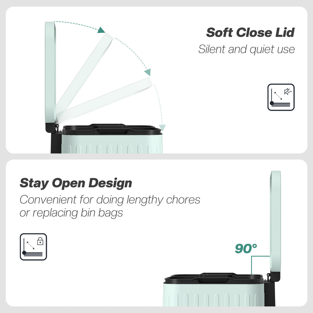 - Pedal opening, with soft-close lid: Simply press to open the lid of this rubbish bin. Gently closes so it doesn't disturb your family.
