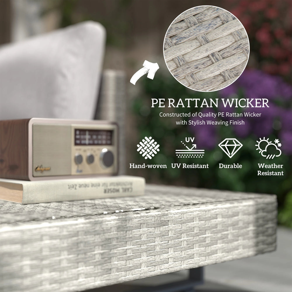 For extremely stylish and comfortable garden seating set, look to this from Outsunny. Comes with a two-seater sofa, three-seater sofa and matching table - freestanding pieces can be arranged differently if you wish. Wrapped in PE rattan, with a metal frame for core support, each piece is solid and durable. Thick padded cushions on the seats and backs ensure youll be relaxing comfortably for hours on end. Finished with a small end table on the two-seater for additional holding room.