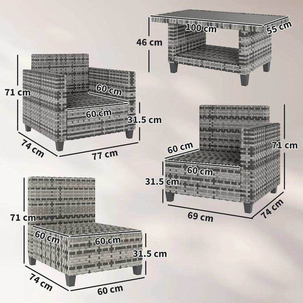 Favourite company gathers round and relaxes in comfort, with this Outsunny six-piece garden sofa set. It comes with two corner chairs, a middle chair, two armchairs and a coffee table - a modular set so you can fix to any shape or position you want. Powder coated steel frames mean a strong core, wrapped in plastic wicker for a stylish and robust rattan look. Complete with seat and back cushions for comfort.