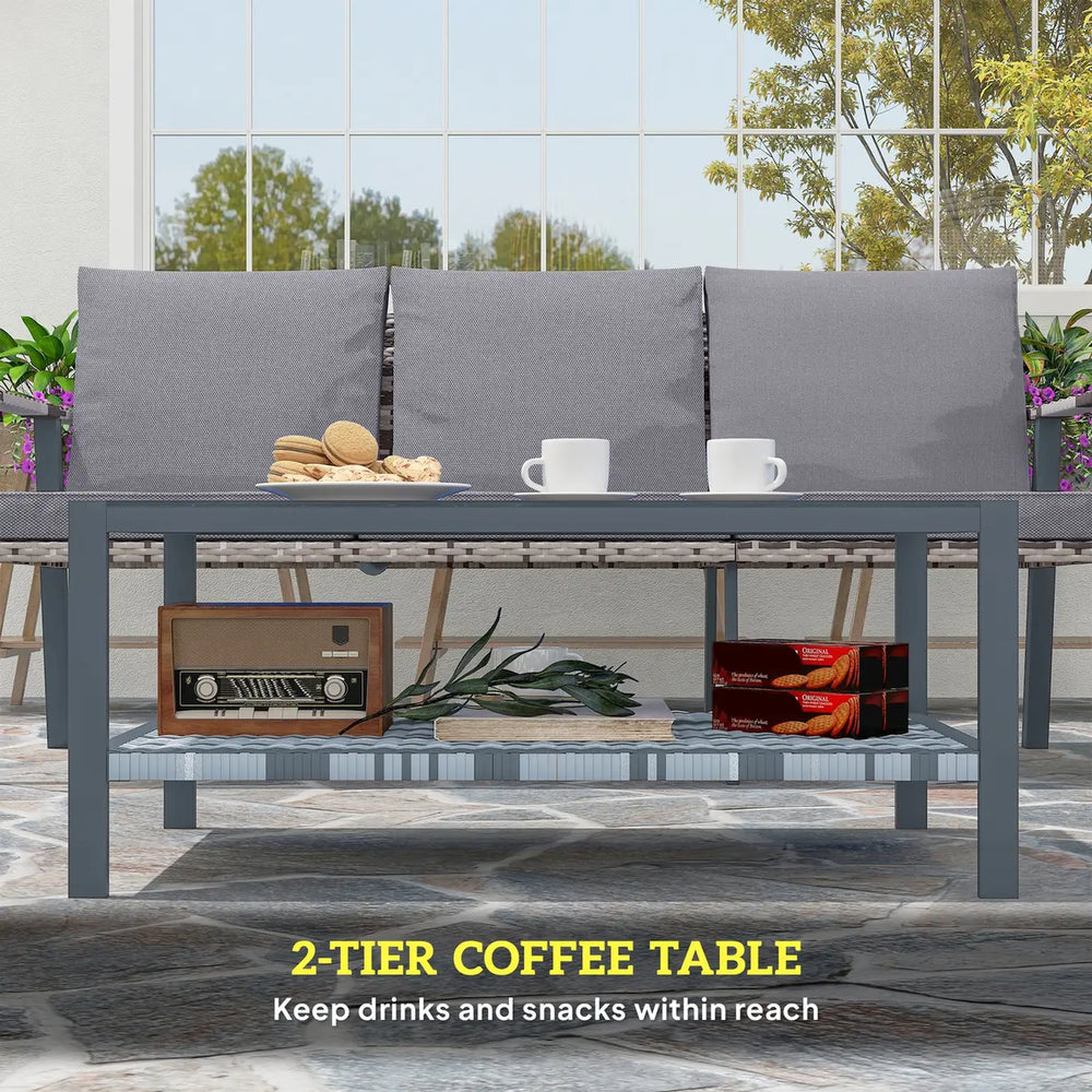 - Two-tier glass-top coffee table: Safe tempered glass is sleek. Upper and lower shelf, to keep double the amount of items within reach - no need to move once seated in this garden set