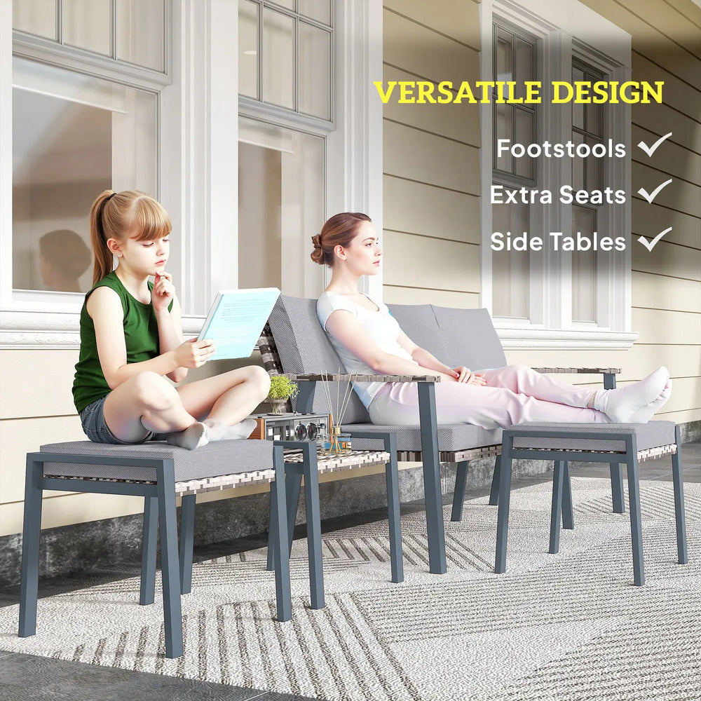 - Six-piece outdoor furniture set: Two armchairs, a three-seater sofa, two footstools and a table. Footstools can be used as extra seats or side tables when needed. Seats up to seven people - bring family and friends together