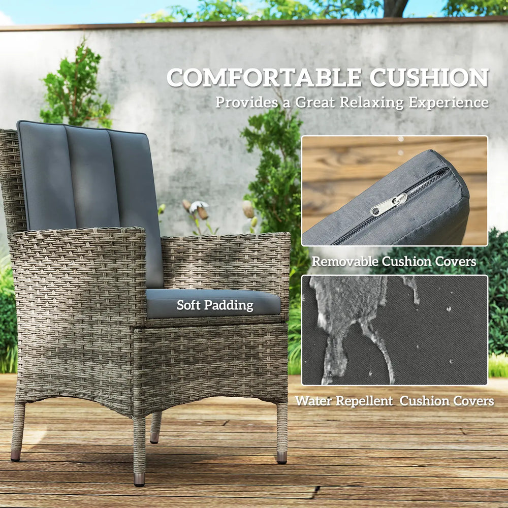 Create a flawless patio with this Outsunny rattan dining set. The powder-coated aluminium frames mean strong frames, wrapped in stylish and protective plastic rattan. The high backs and armrests support your body as you sit, with padded cushions for comfort. The outdoor dining table and chairs set is complete with a glass-top table, with 4.2 cm middle hole to hold parasol in place.