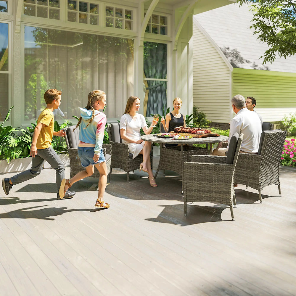 Outsunny Seven-Piece Rattan Dining Table, with Round Glass-Top Table - Light Grey