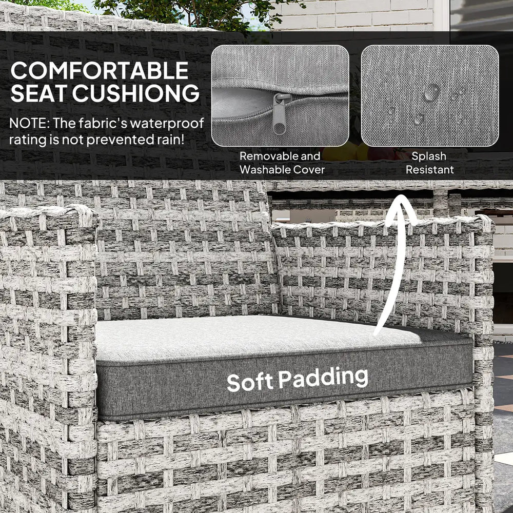 Enjoy alfresco dining with the Outsunny rattan dining set, a charming addition to any outdoor space. This 5-piece garden dining set, featuring four cosy chairs with washable cushions and a sleek table, promises comfort and style. Crafted from all weather double-strand half-round PE rattan with a robust steel frame, it's designed to weather the elements, making it a staple for any garden table and chairs collection.