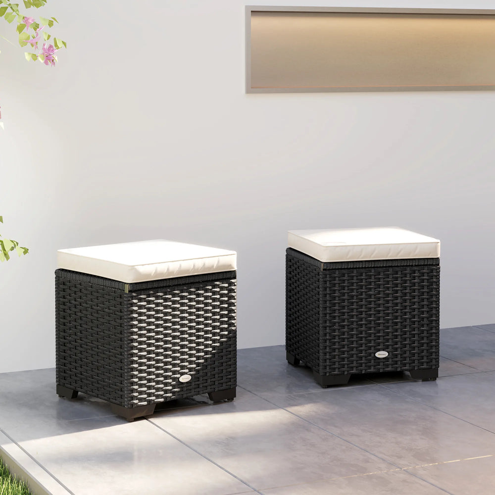 Outsunny Set of 2 Rattan Storage Ottoman, Outdoor Footstool with Removable Cushions, Garden Storage Seat for Balcony, Porch, Living Room, Cream
