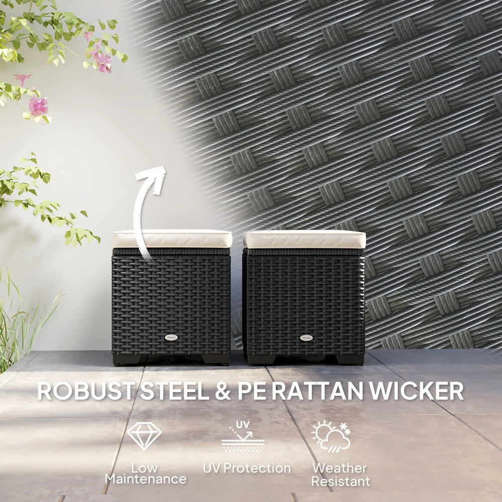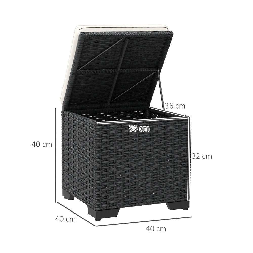 Discover the charm of Outsunny's rattan garden stool, blending style and functionality. Its lift-off lids reveal lots of storage for all your bits and bobs, from books to gardening tools. Enjoy upgraded comfort with thick, cushy seats that easily zip off for cleaning. This versatile piece serves wonderfully as a small footstool or extra seating, crafted to endure the elements with a robust steel frame.